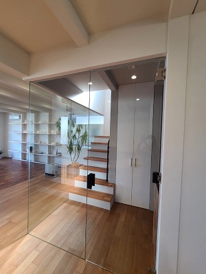 ベネチアンガラスのシャンデリアにガラス壁の階段